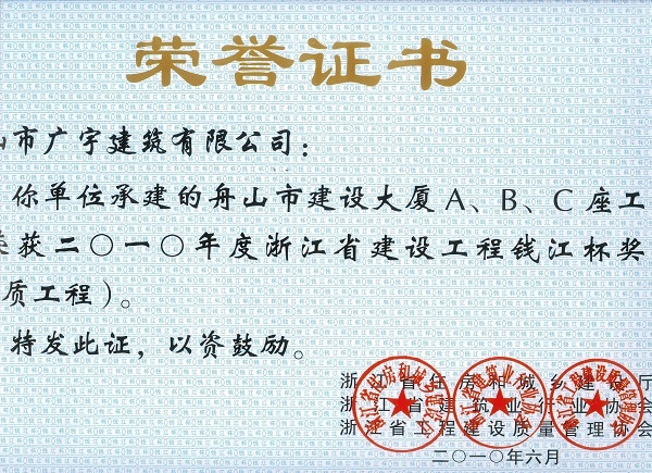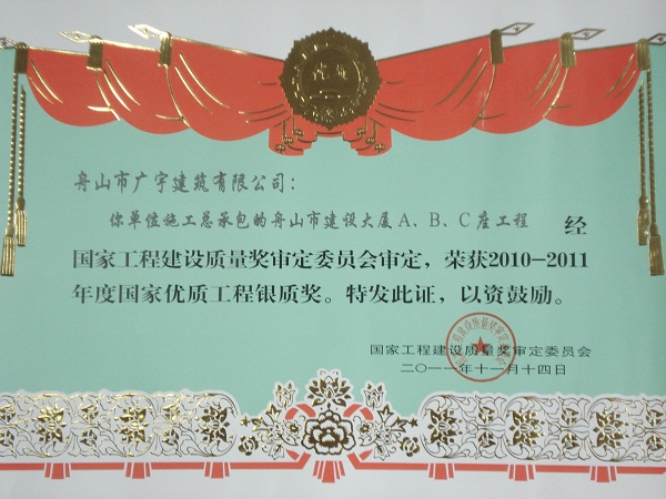 2010-2011年度國家優(yōu)質(zhì)工程獎銀質(zhì)獎(舟山建設大廈C座)